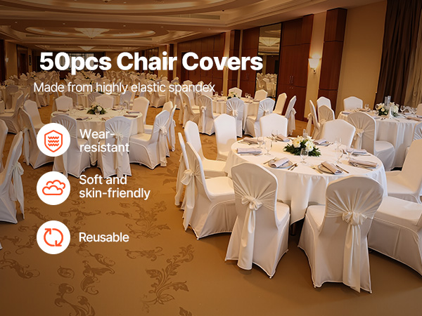 VEVOR's stretch spandex folding chair covers offer a flawless fit for a variety of chair types. Made from high-quality, stretchable spandex, these covers comfortably conform to folding and banquet chairs, providing a sleek and polished appearance. The elastic material ensures a secure, no-slip fit that stays in place throughout the event. These covers enhance the overall look of your space, transforming any venue into an elegant setting. Perfect for weddings, banquets, and other special occasions, they offer both functionality and style. With these covers, your event will maintain a refined aesthetic, regardless of the chair types in your venue.