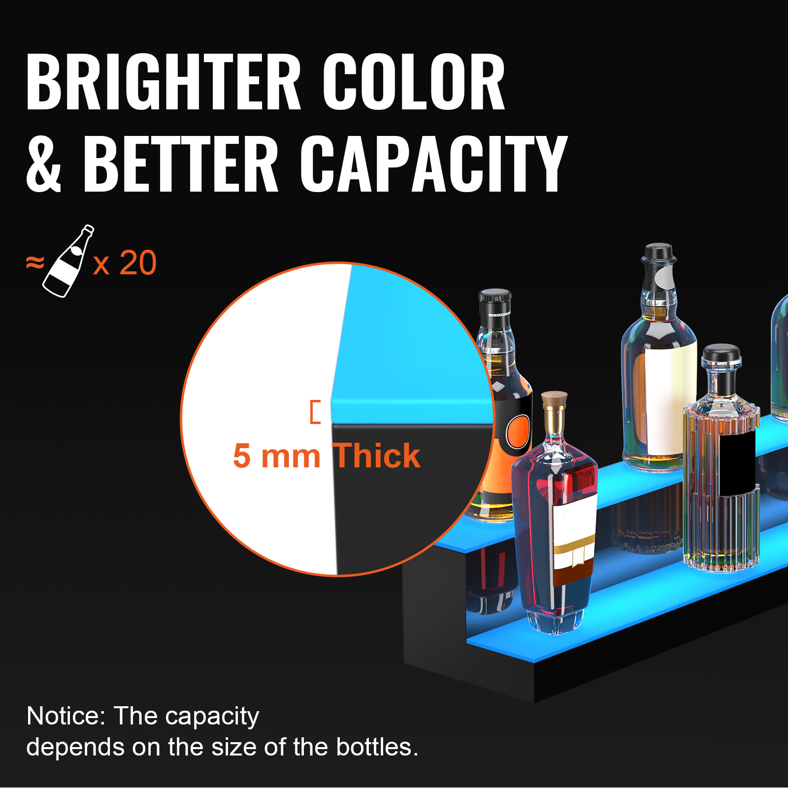 This shelf features a 2-step bottle display shelf. You can display more bottles in a compact space. This design optimizes your bar area, making it look neat and organized. Each step can hold around 10–13 bottles, depending on size. Also, this design improves visibility so you can see and access your bottles easily. The two-step structure adds a modern and stylish look to your bars. It's perfect for those who have limited space but want to showcase their collection effectively. Both functional and aesthetically pleasing design makes it incredibly versatile for any bar setup.