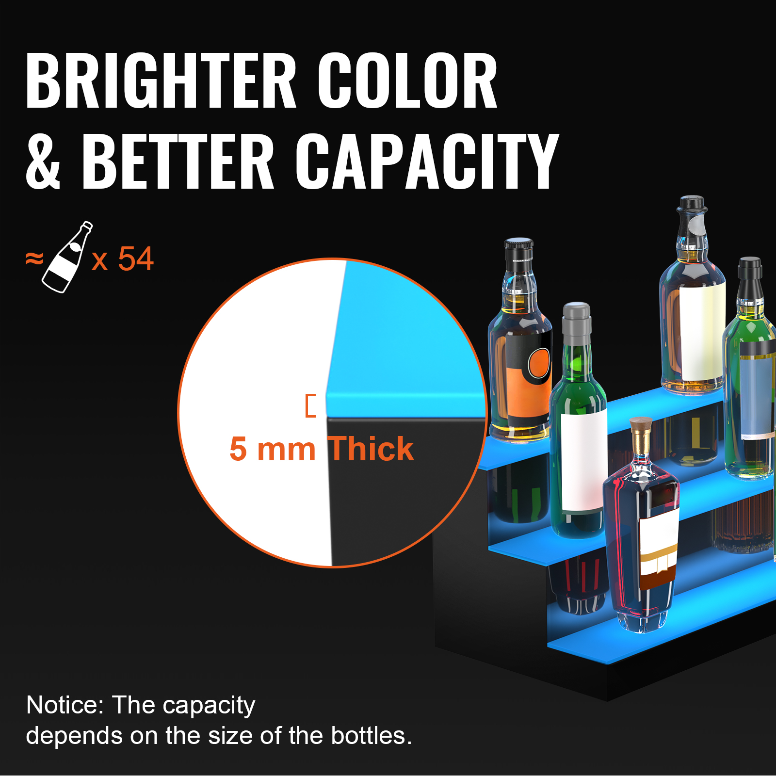 The VEVOR LED lighted liquor display is spacious and efficient. It can hold up to 54 bottles, making it ideal for large collections. The 3-step liquor bottle display provides ample space for different bottle sizes. This design helps organize your bottles neatly. Also, it makes it easy to access your drinks. The steps are deep enough to prevent bottles from falling off. These designs maximize storage while maintaining a sleek profile. They're perfect for both small and large bars. You can display all your bottles beautifully. The spacious nature of the shelf ensures that you can showcase all your bottles beautifully.