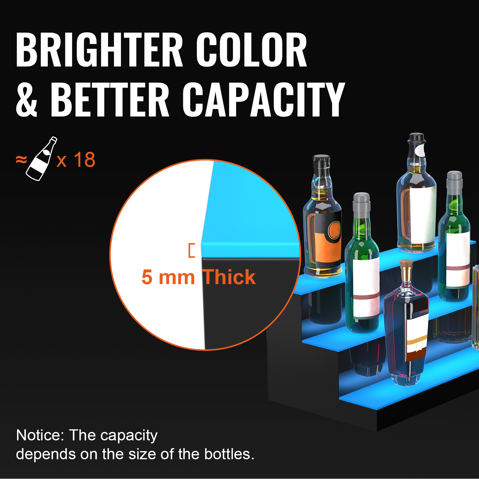 The VEVOR LED lighted liquor bottle display is a game-changer for your bar. This shelf makes your bottles shine with bright, colorful lights. It fits perfectly into any home bar, giving a'modern vibe'. The lights are bright enough to highlight each bottle, adding elegance to your setup. Our shelf is designed to catch the eye and create a stylish display. For those who want to make a unique bar area, this display is perfect because it’s made in upscale ways.